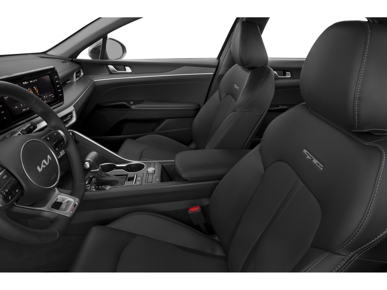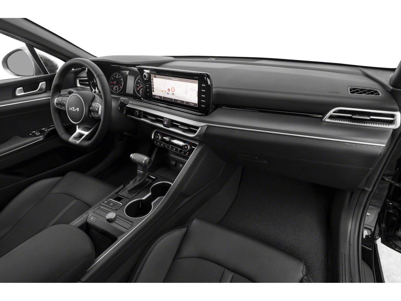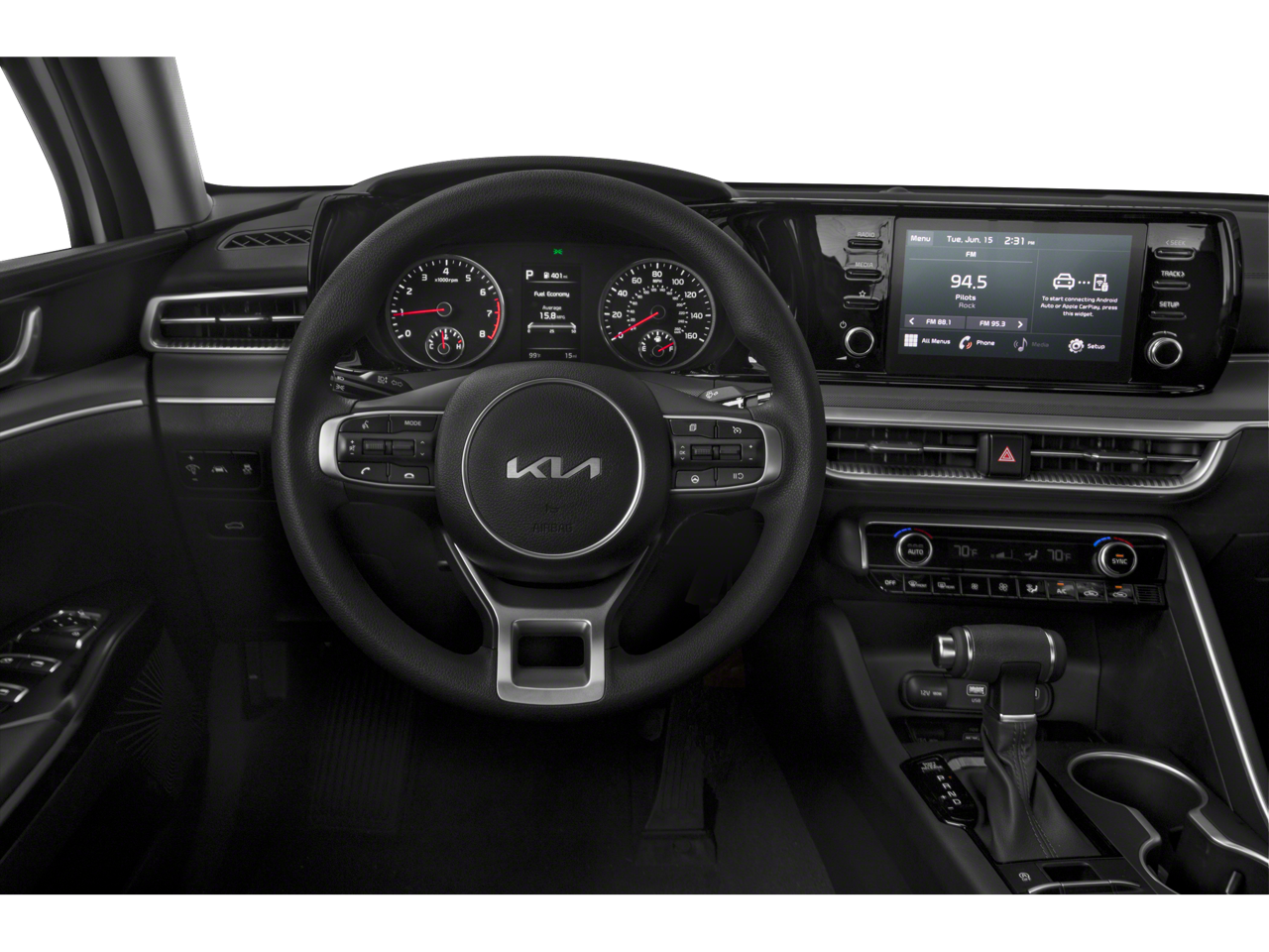 This Kia K5 is well equipped and includes, 6 Speakers, Air Conditioning, Alloy wheels, AM/FM radio: SiriusXM, Apple CarPlay & Android Auto, Auto High-beam Headlights, Automatic temperature control, Brake assist, Bumpers: body-color, Cloth/Leatherette Seat Trim, Delay-off headlights, Electronic Stability Control, Front Bucket Seats, Front Center Armrest, Front dual zone A/C, Front fog lights, Fully automatic headlights, Heated door mirrors, Heated Front Bucket Seats, Heated front seats, Navigation System, Passenger door bin, Power door mirrors, Power driver seat, Power steering, Power windows, Radio data system, Radio: AM/FM/MP3 Audio System, Rear window defroster, Remote keyless entry, Split folding rear seat, Spoiler, Steering wheel mounted audio controls, Turn signal indicator mirrors, Variably intermittent wipers, Wheel Locks, Wheels: 7.5J x 18 Gloss Black Machined Finish Alloy. 2022 Wolf Gray Kia K5 4D Sedan GT-Line AWD I4